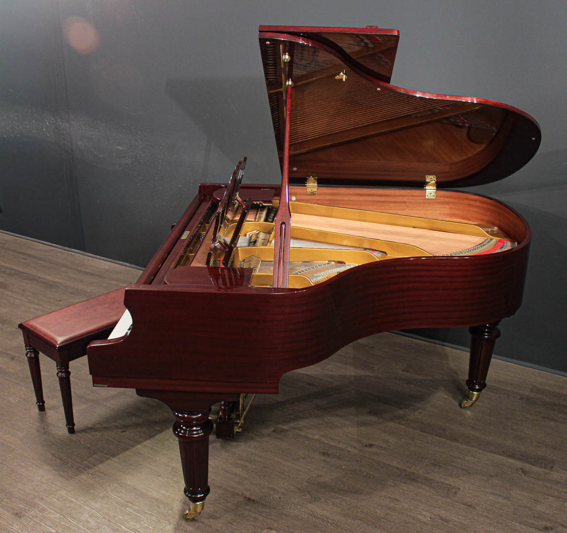 The instrument features a gorgeous red ribbon mahogany cabinet with lovely decorator touches (round, reeded legs with brass ferrules, matching pedal lyre, and ornate music desk) that will make this instrument a fantastic addition to any home. It's a delightful mixture of a wonderful musical instrument and a unique piece of furniture that could be perfect for your decor!