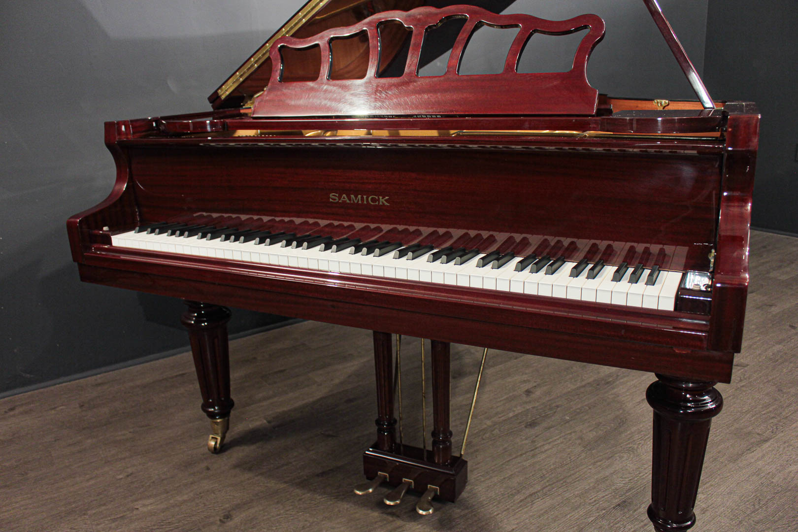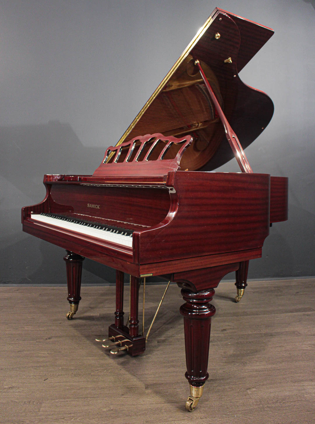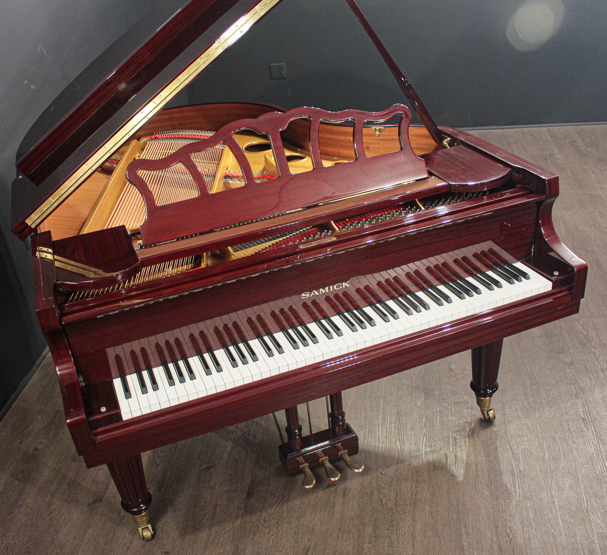 This Samick 5'7'' Decorator Grand Piano, model SIG-57L, is a great opportunity to own a modern grand piano, ''ready to play'' with a great tone and touch and beautiful decorator appointments, at an extremely affordable price.  It is in very good overall condition, cosmetically and musically.