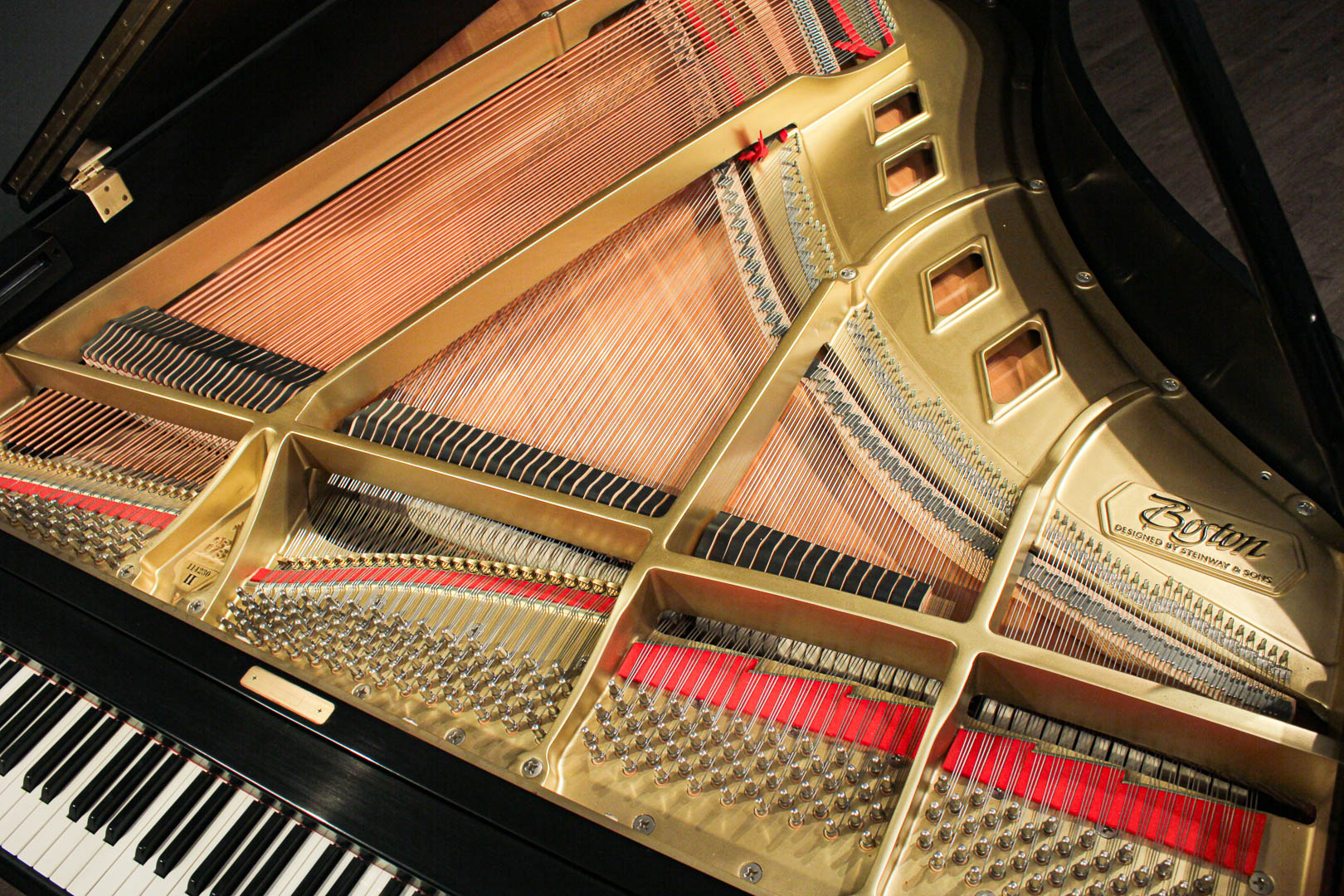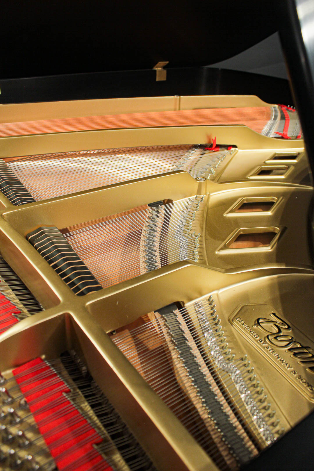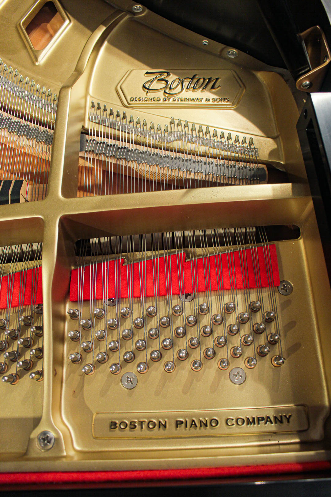 In comparison to other pianos, the Boston has less string tension. This reduced string tension allows for a larger, tapered soundboard, creating longer sustain, and more singing quality in the tone (as well as longer piano life). A wealth of other engineering enhancements, including optimal placement of ribs, braces, and bridges, also contribute to the Boston’s superior tone and greater stability.