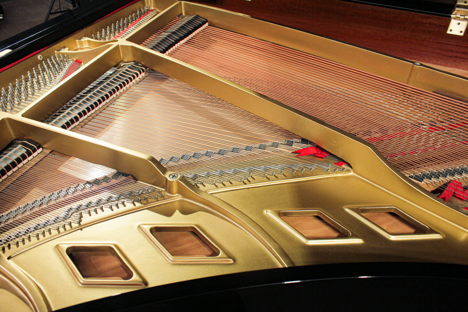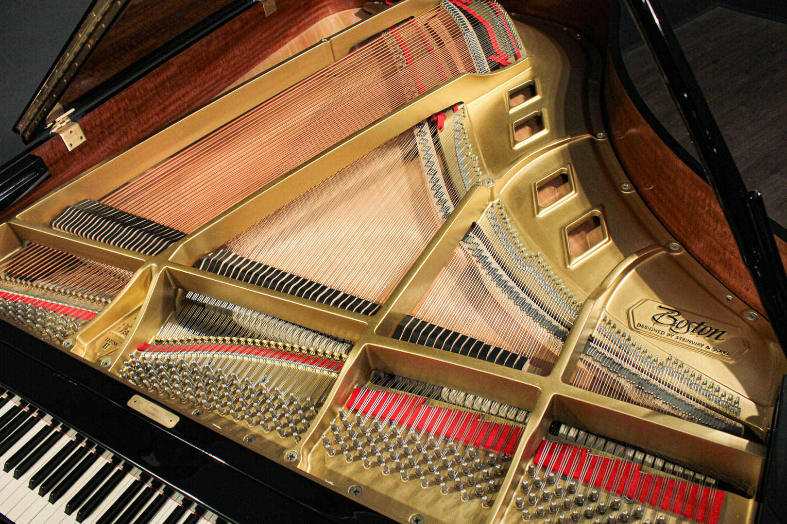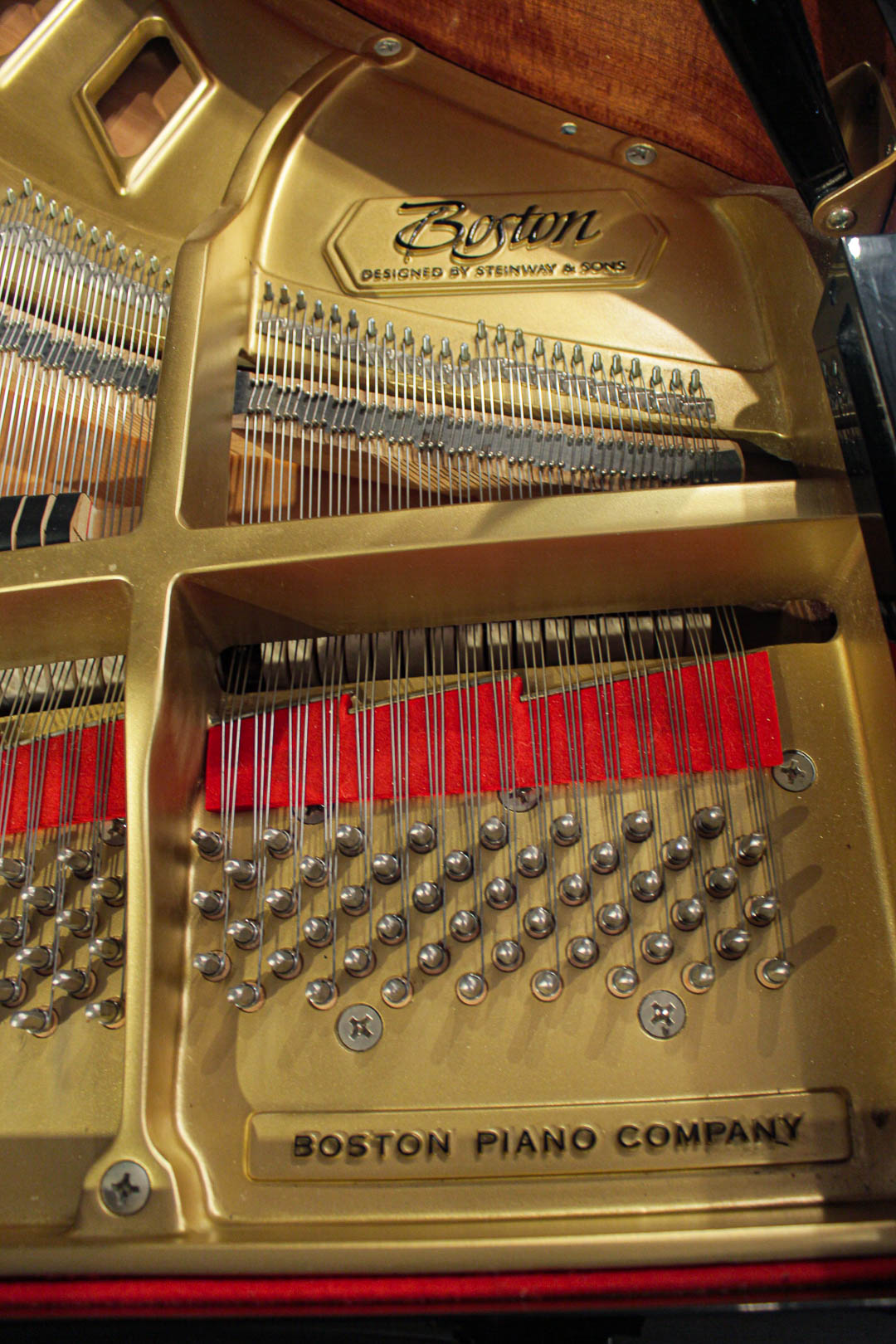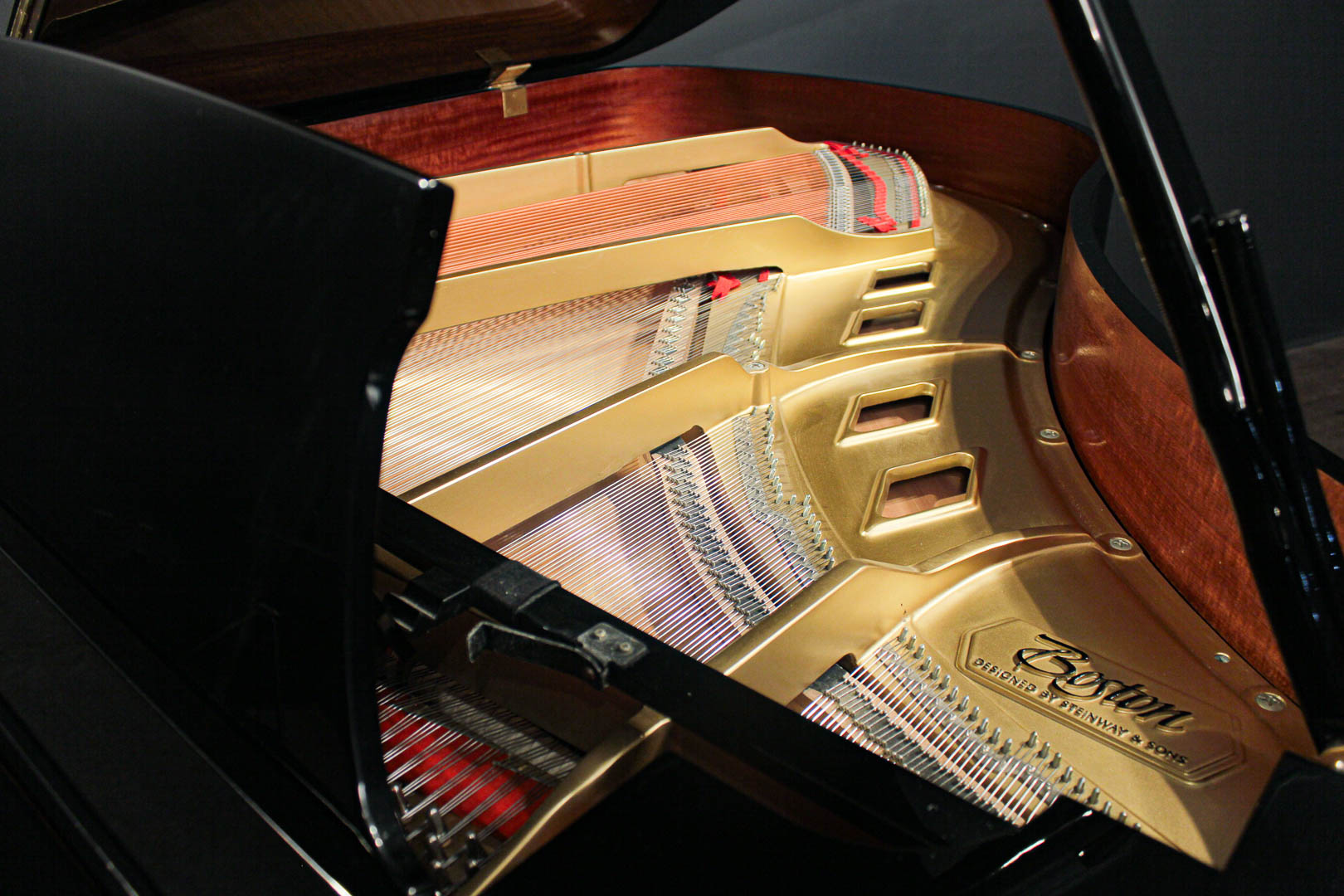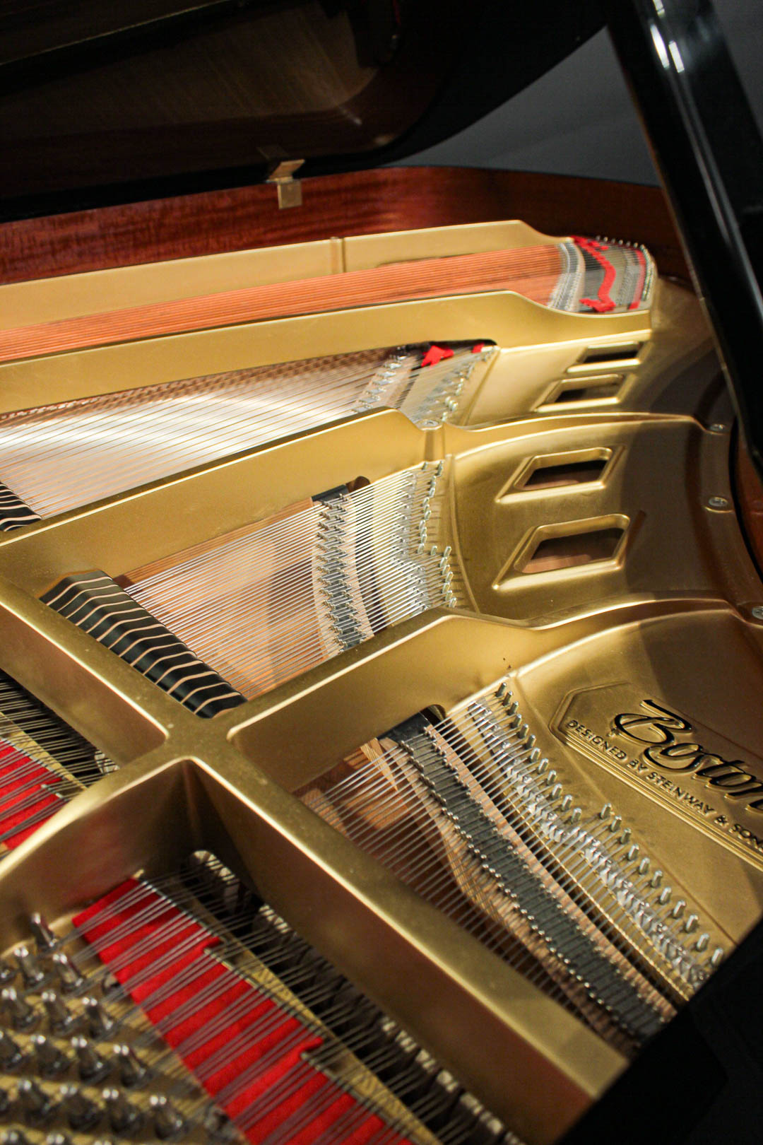 In comparison to other pianos, the Boston has less string tension. This reduced string tension allows for a larger, tapered soundboard, creating longer sustain, and more singing quality in the tone (as well as longer piano life). A wealth of other engineering enhancements, including optimal placement of ribs, braces, and bridges, also contribute to the Boston’s superior tone and greater stability.