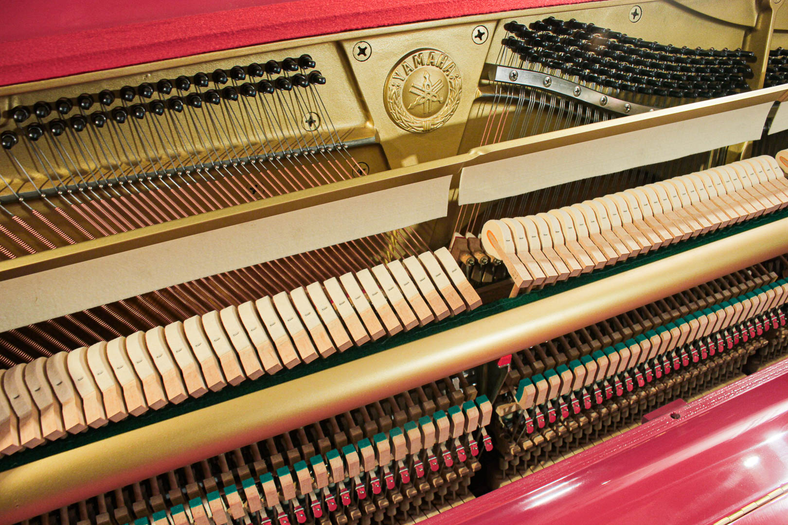 Warn or degraded hammer return spring cords are replaced on Yamaha upright pianos to ensure proper note repetition and dexterity of the action.