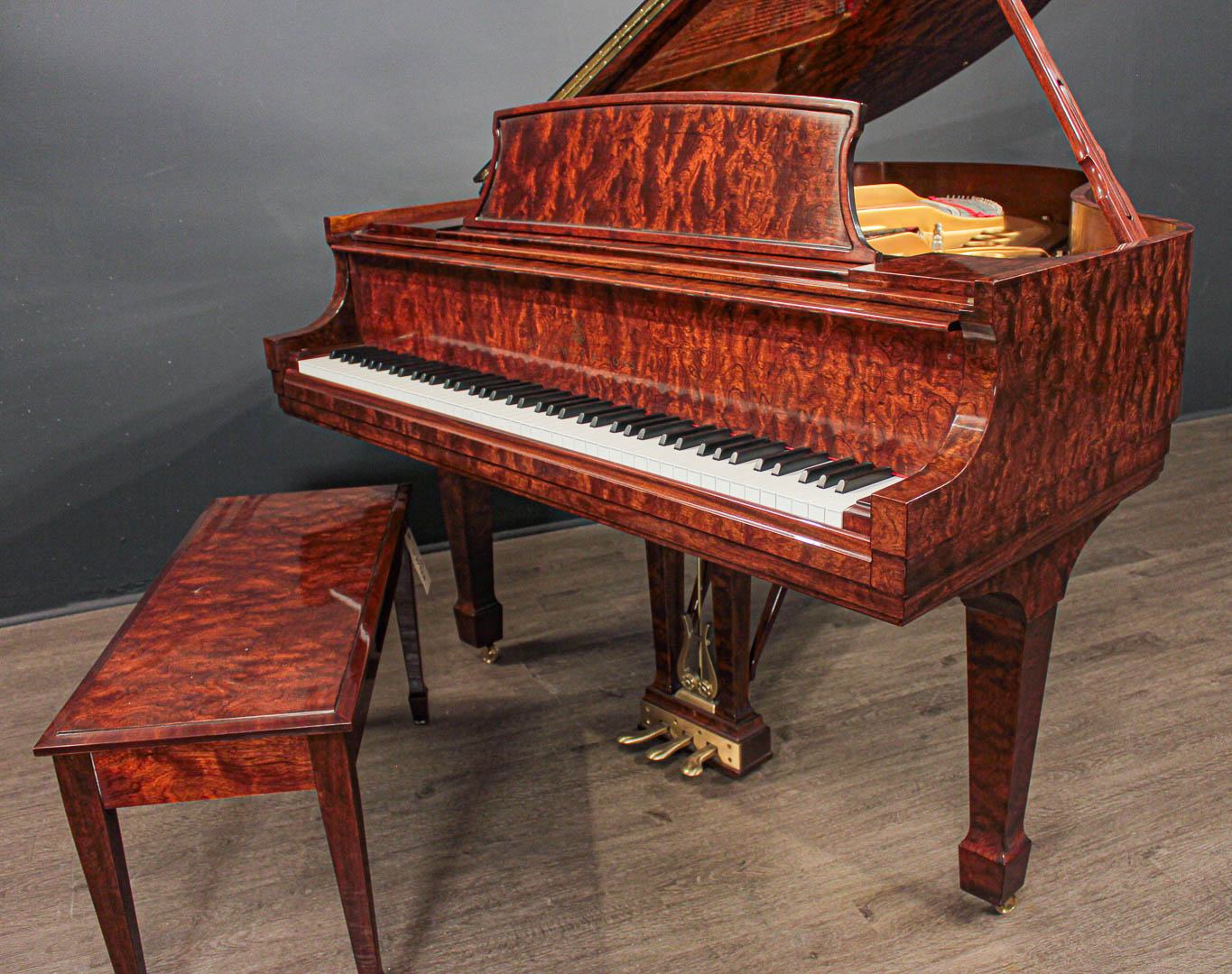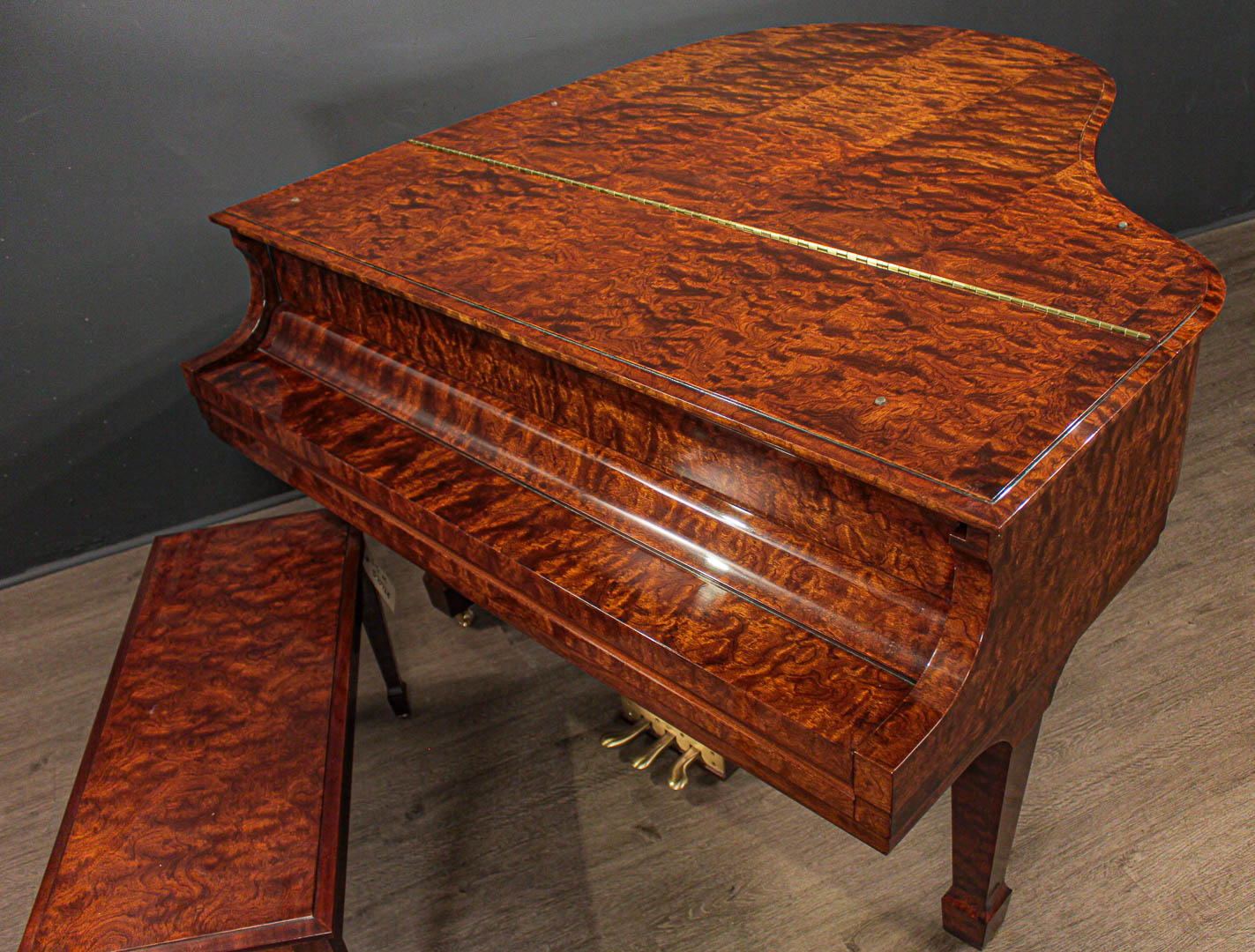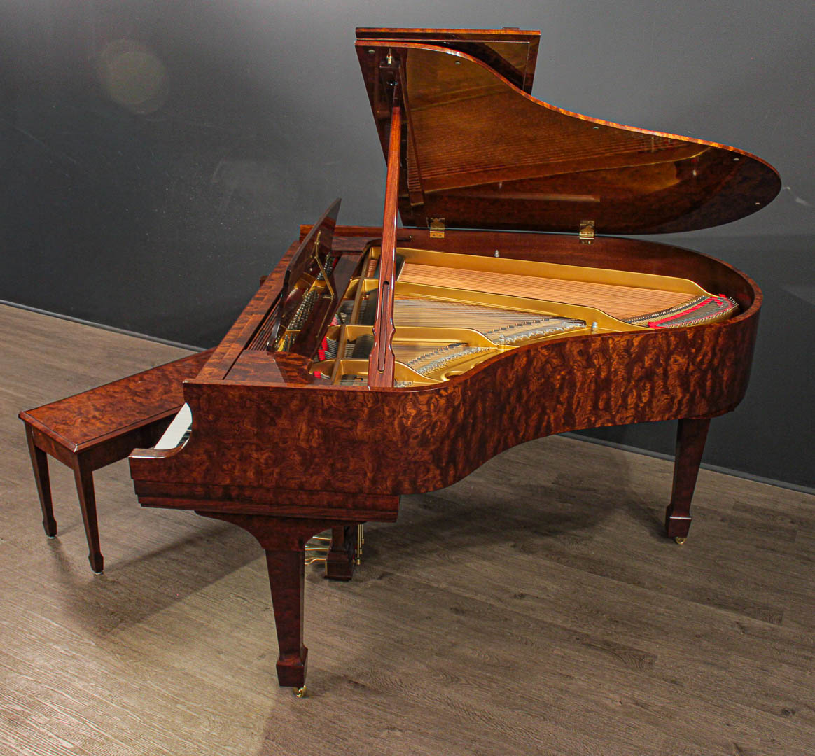 Kewazinga Bubinga is a highly desirable wood from West Africa. Its unique, richly contrasting grain and soft, bright sheen give this piano a wonderful lightness and irresistible charm.