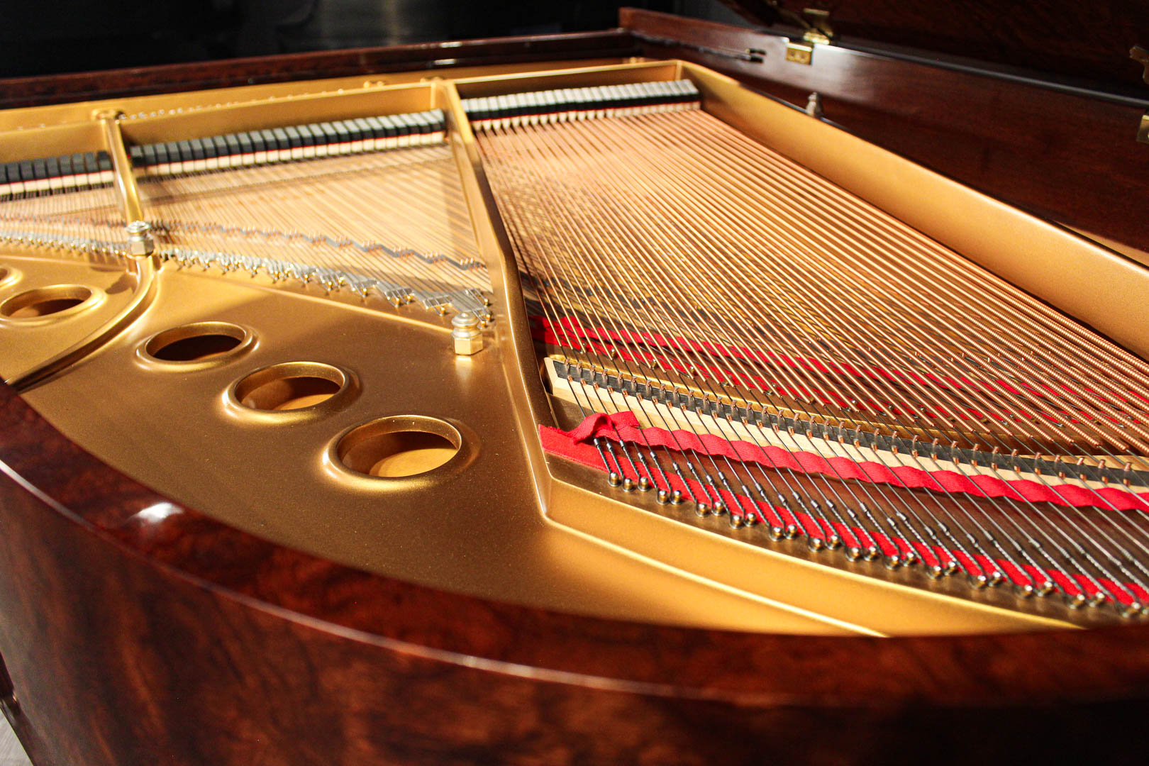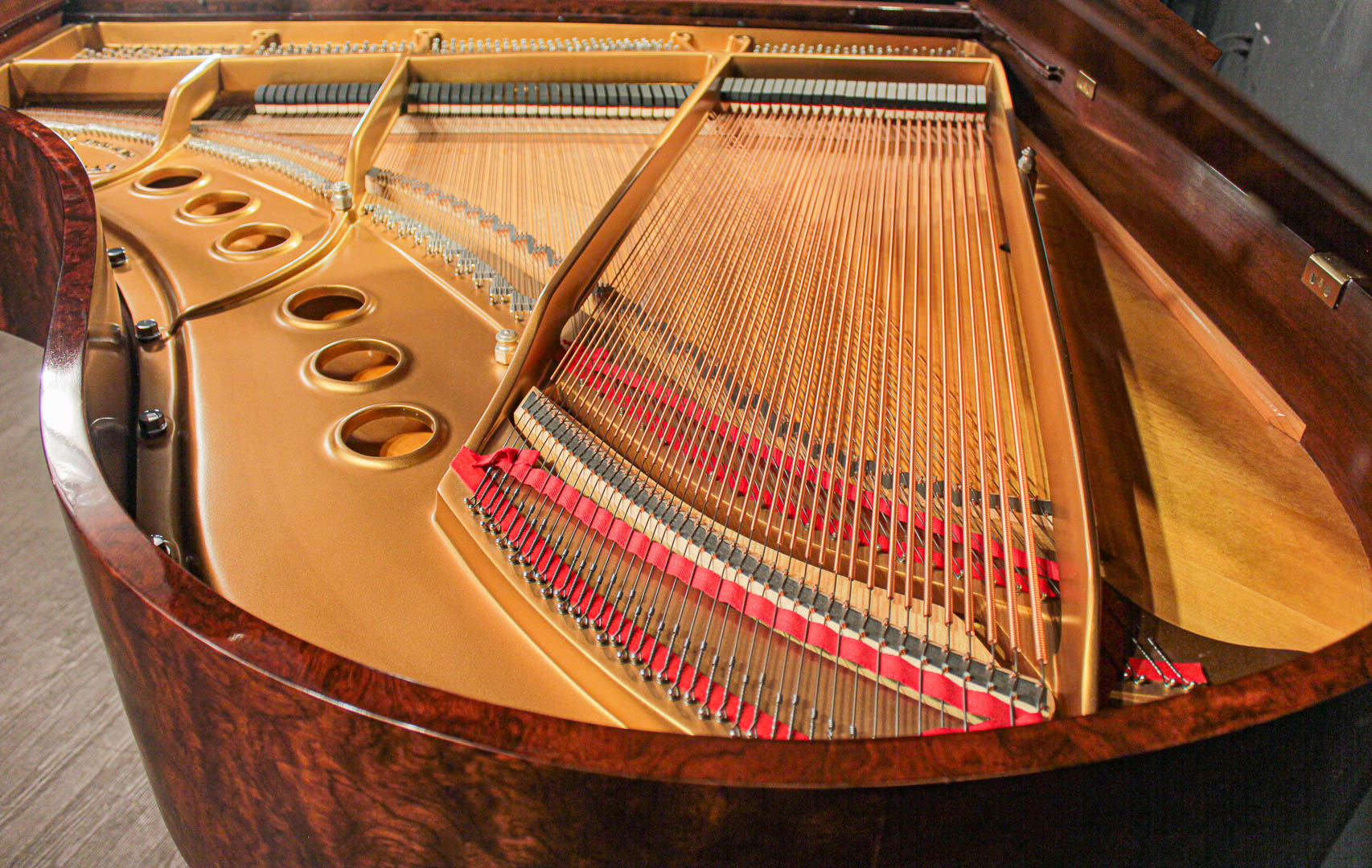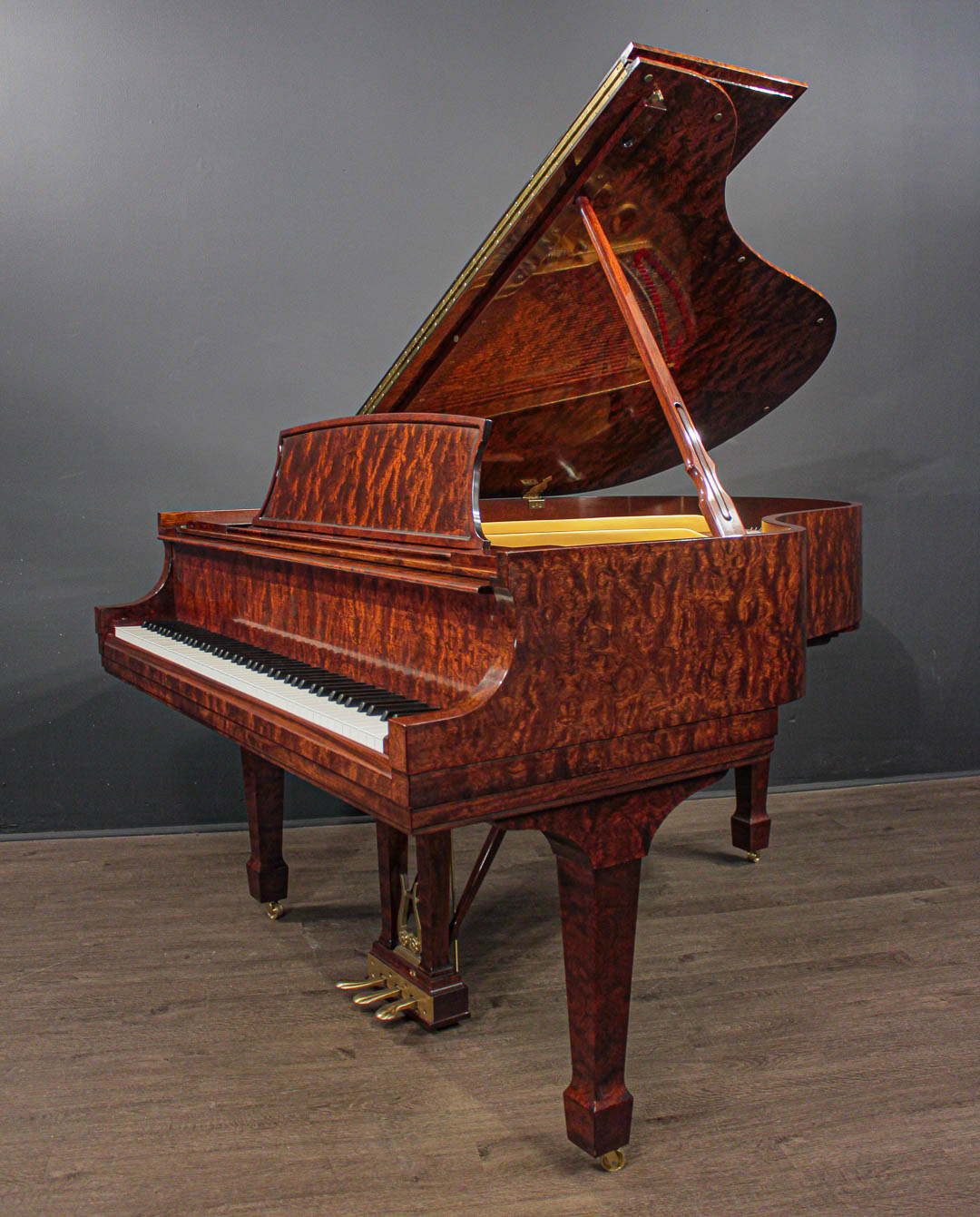 Kewazinga Bubinga is a highly desirable wood from West Africa. Its unique, richly contrasting grain and soft, bright sheen give this piano a wonderful lightness and irresistible charm.