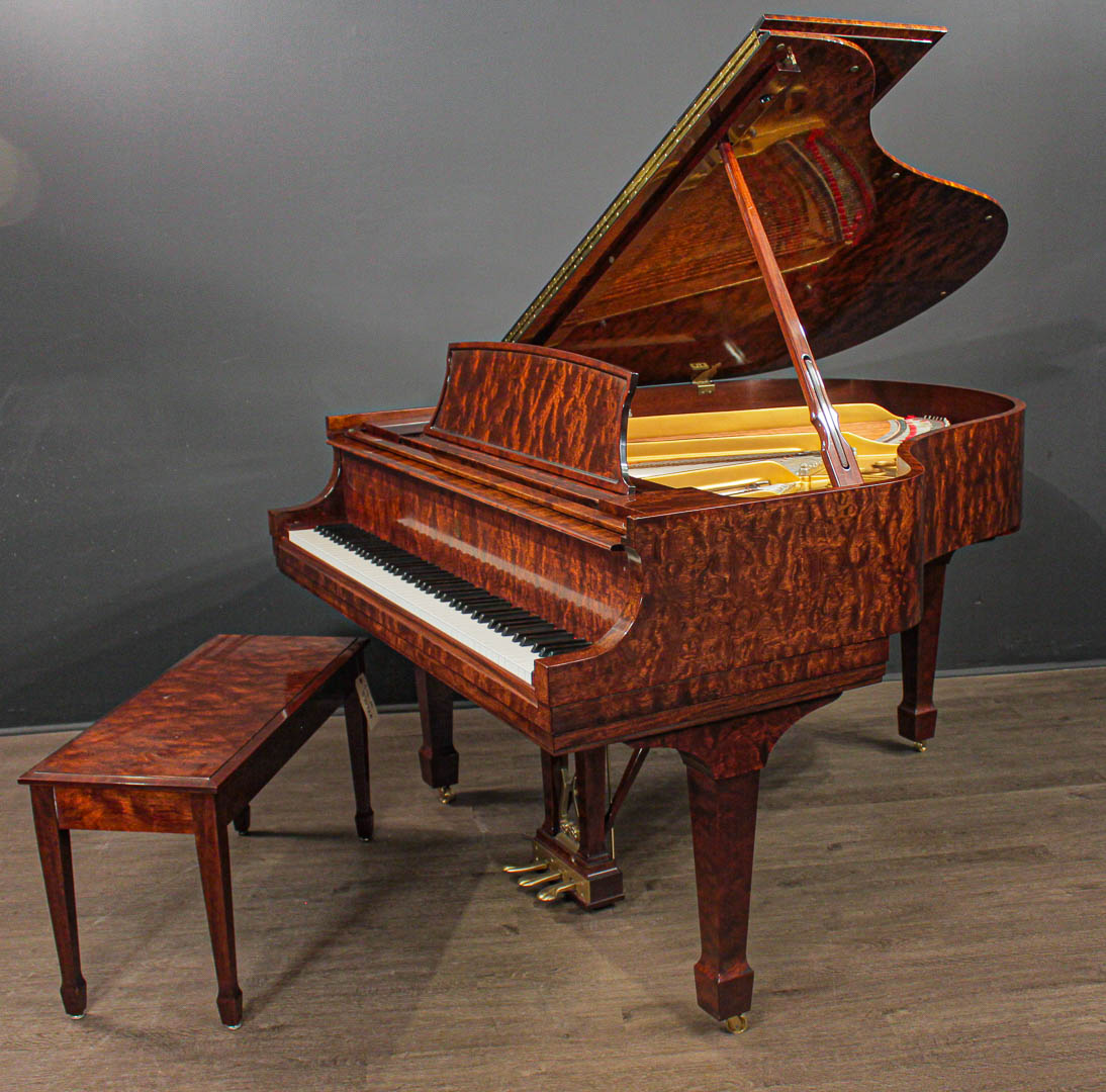 Crown Jewel finishes are still a unique and prized element of Steinway's current piano production, and are available on a very limited basis as dictated by the supply of the sought-after veneers they employ. The comparable Steinway Model M in Crown Jewel Kewazinga Bubinga is still available from Steinway, priced new over $138,000 (a $40,000 upcharge over the basic ebony finish), so we're certain you'll appreciate the tremendous value afforded by this beautiful late-model specimen.